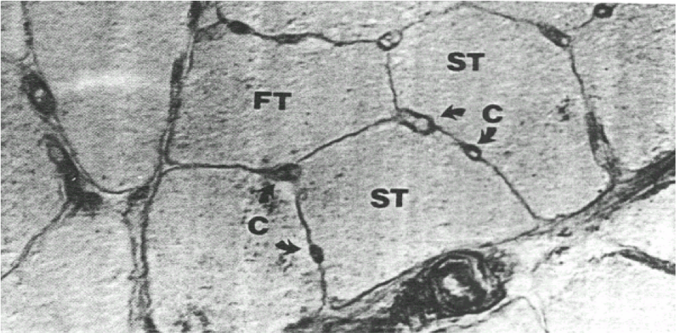 Fig. 14 Microscopic view of muscle intersection (Musculus gastrocnemius) of a first-class marathoner. Note the capillaries surrounding each muscle fiber and secure interchange of oxygen and energy resources. The average number of capillaries for 1000 mm2 of a muscle intersection is 0.84 with an untrained person, 0.94 with a medium trained person and 1.25 with an endurance trained person. (Wilmore & Costill, 1999)